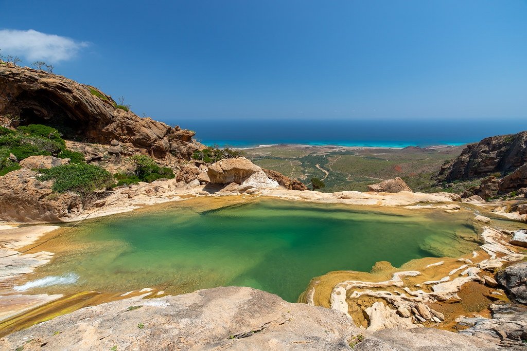 Homhil Protected Area is a lush plateau on the northeast of Socotra. While other areas of the island are dominated by the iconic Dragon’s Blood Trees, Homhil is unique because it feels like a "botanical garden in the clouds", featuring the island’s highest concentration of Frankincense trees alongside a famous natural infinity pool, the natural rock basin perched at the very edge of the plateau. As you swim, the water appears to merge with the Arabian sea hundreds of meters below. It offers a panoramic vista of the coastline and the blue horizon. Reaching the pool usually involves a 30 minute hike from the main plateau entrance. The trail takes you through a landscape of bizarre trees before opening up to the cliffside view. Freshwater pools is fed by natural springs, providing a cool, refreshing break from the arid heat of the plateau.